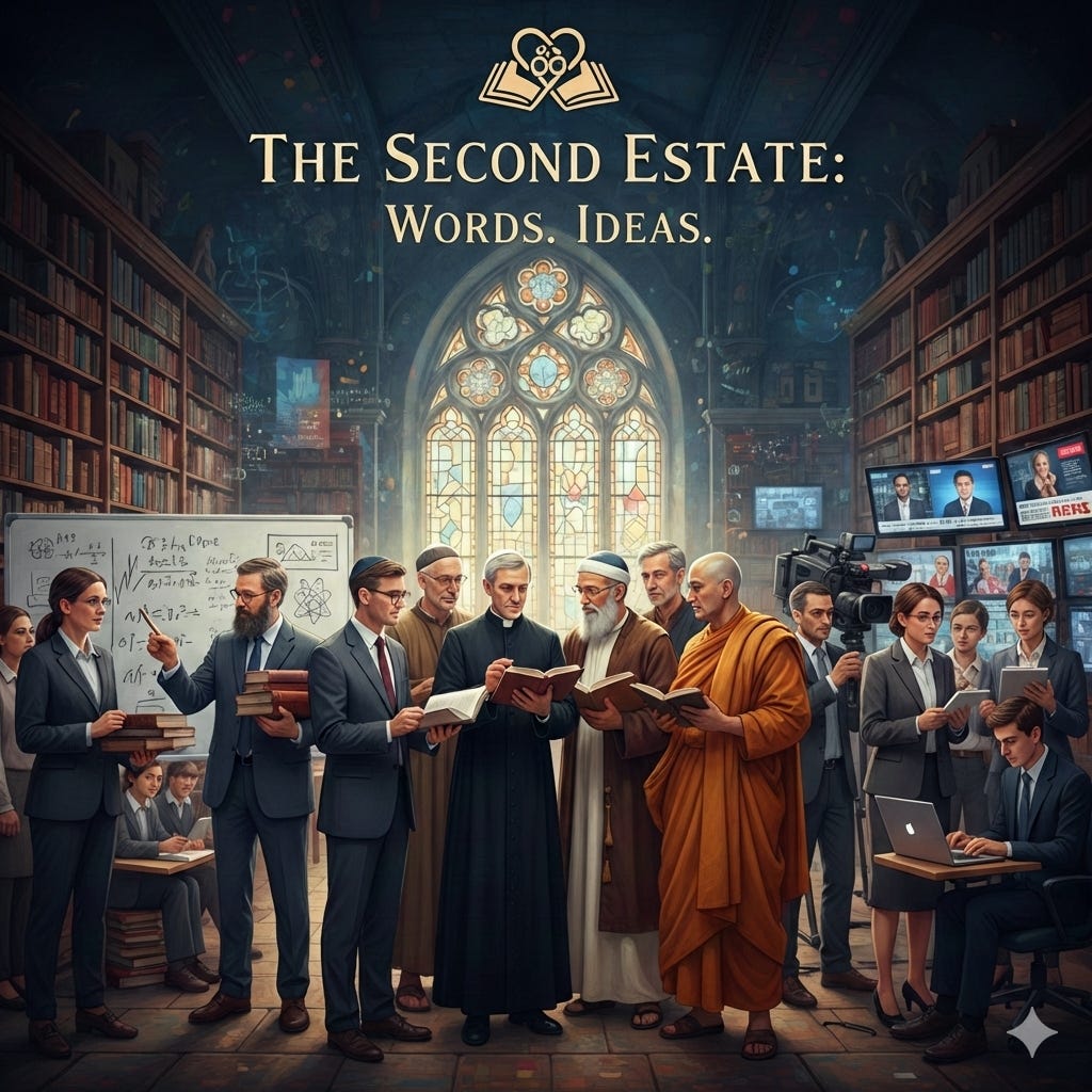Excellent. The framing of many issues by the second estate leads me to think in terms of the more intense political ideologies as cults, being that they are based on articles of faith that only the insiders consider valid. Looking at these as a meta-religion with a priesthood cuts through a lot of the fluff and nonsense justifications. It also calls into question the idolatry of older religious denominations and institutions that have been ideologically captured by said theological-political cults.